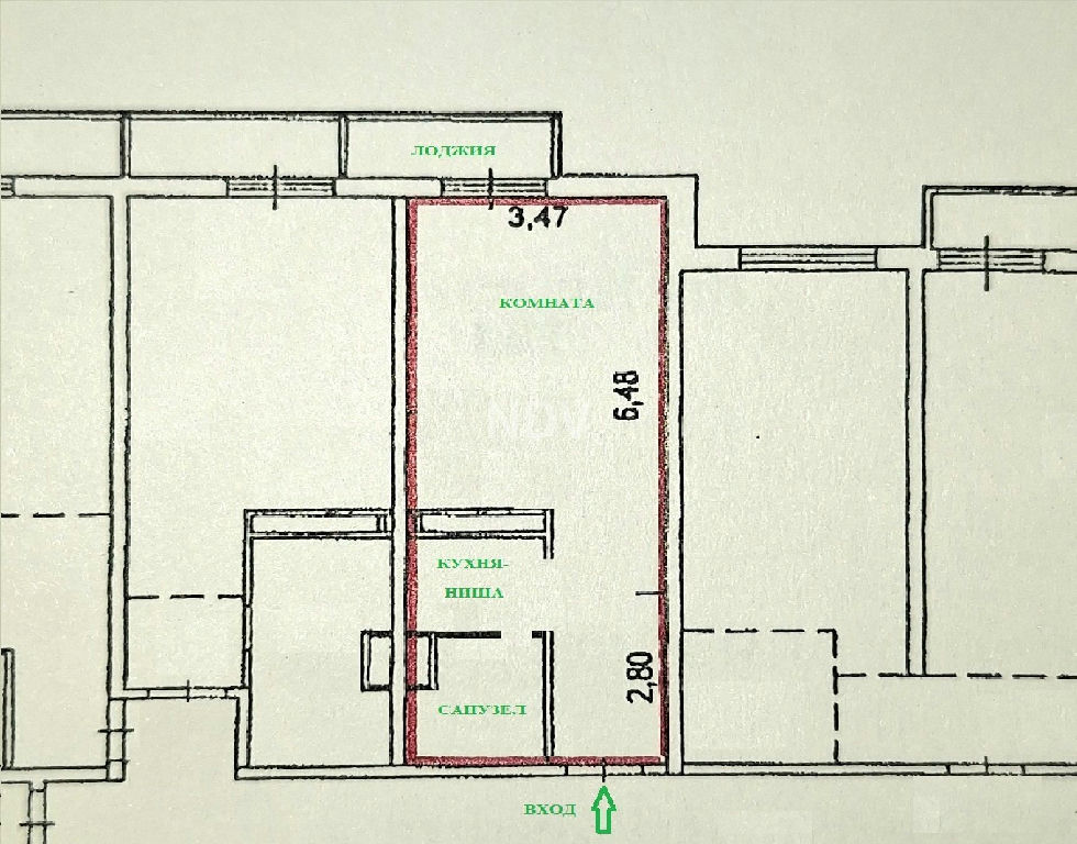 Просторная комната с кондиционером, кухня - ниша, санузел с ванной, лоджия с зимним остеклением, потолки 2,8 метра,